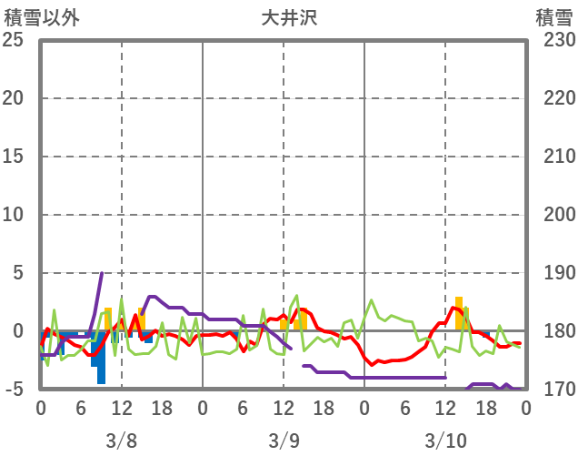 | 日 | 時 | 気温 | 降水 | 風向/風速 | 日照 | 積雪 | 降雪 |