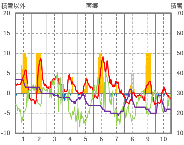 | 日 | 時 | 気温 | 降水 | 風向/風速 | 日照 | 積雪 | 降雪 |