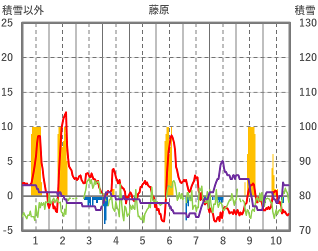 | 日 | 時 | 気温 | 降水 | 風向/風速 | 日照 | 積雪 | 降雪 |