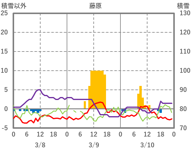 | 日 | 時 | 気温 | 降水 | 風向/風速 | 日照 | 積雪 | 降雪 |