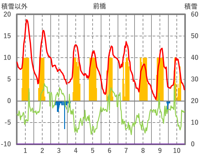 | 日 | 時 | 気温 | 降水 | 風向/風速 | 日照 | 積雪 | 降雪 |