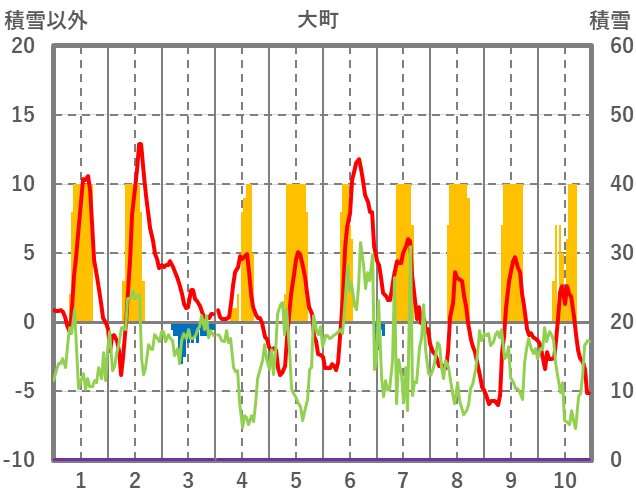 | 日 | 時 | 気温 | 降水 | 風向/風速 | 日照 | 積雪 | 降雪 |