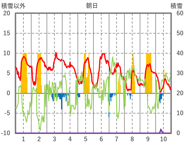 | 日 | 時 | 気温 | 降水 | 風向/風速 | 日照 | 積雪 | 降雪 |