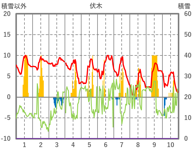 | 日 | 時 | 気温 | 降水 | 風向/風速 | 日照 | 積雪 | 降雪 |
