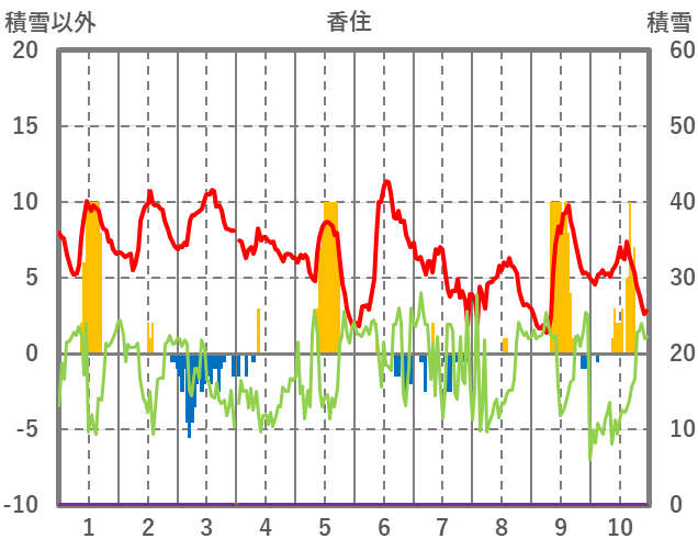 | 日 | 時 | 気温 | 降水 | 風向/風速 | 日照 | 積雪 | 降雪 |