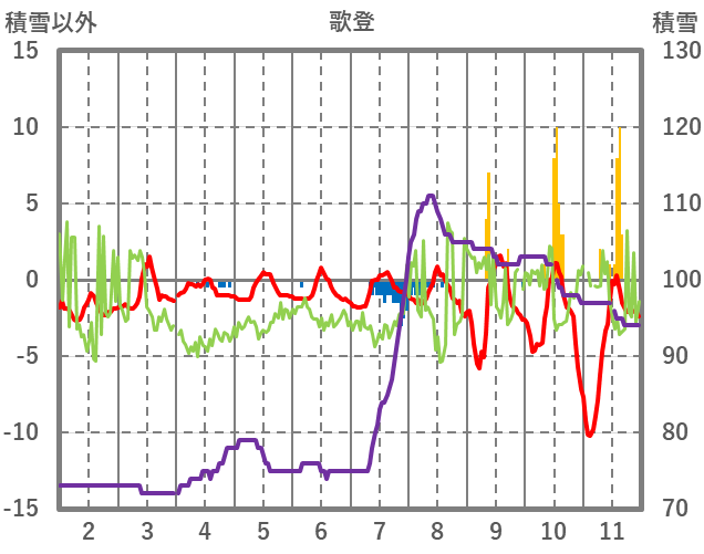 | 日 | 時 | 気温 | 降水 | 風向/風速 | 日照 | 積雪 | 降雪 |