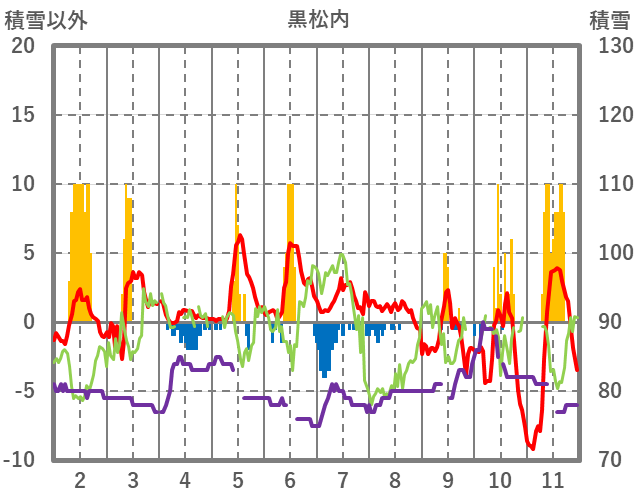 | 日 | 時 | 気温 | 降水 | 風向/風速 | 日照 | 積雪 | 降雪 |
