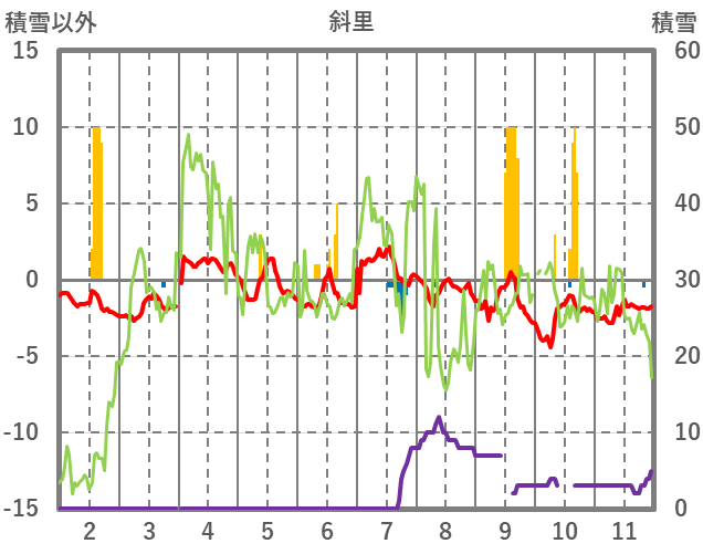 | 日 | 時 | 気温 | 降水 | 風向/風速 | 日照 | 積雪 | 降雪 |