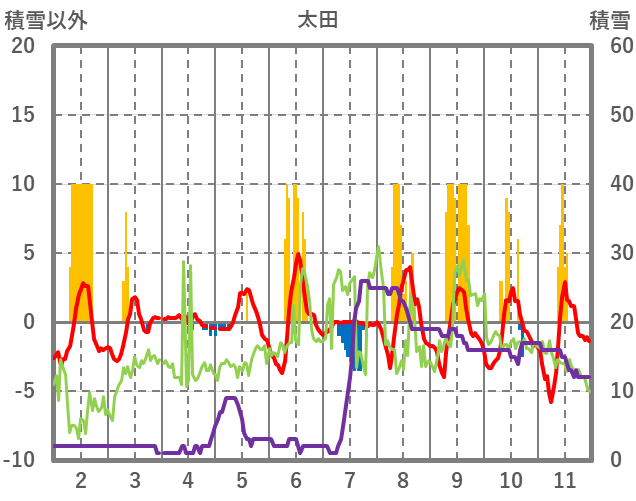| 日 | 時 | 気温 | 降水 | 風向/風速 | 日照 | 積雪 | 降雪 |