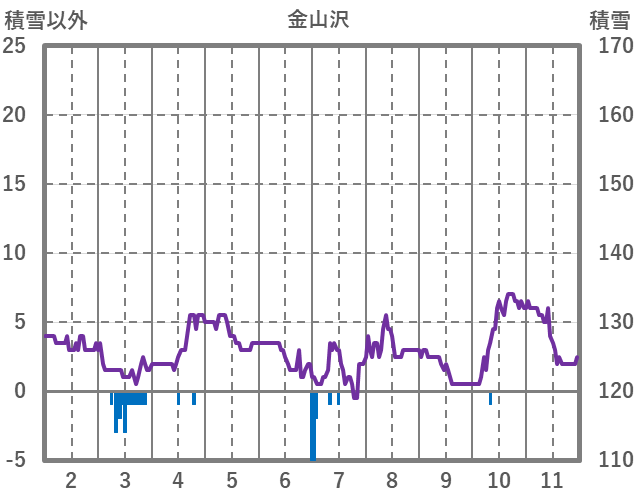 | 日 | 時 | 気温 | 降水 | 風向/風速 | 日照 | 積雪 | 降雪 |