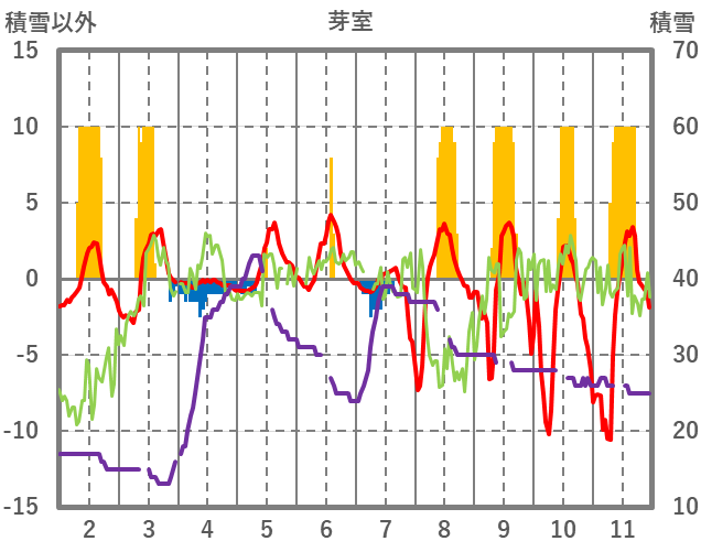 | 日 | 時 | 気温 | 降水 | 風向/風速 | 日照 | 積雪 | 降雪 |
