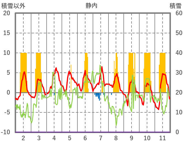 | 日 | 時 | 気温 | 降水 | 風向/風速 | 日照 | 積雪 | 降雪 |