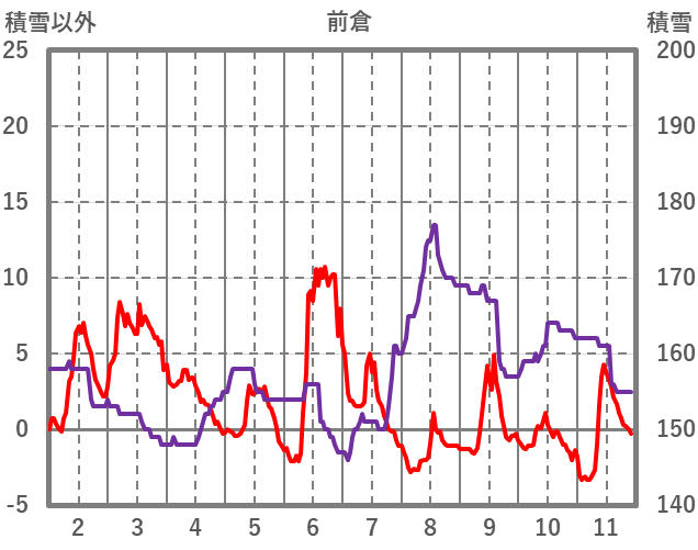 | 日 | 時 | 気温 | 降水 | 風向/風速 | 日照 | 積雪 | 降雪 |