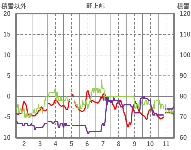 | 日 | 時 | 気温 | 降水 | 風向/風速 | 日照 | 積雪 | 降雪 |