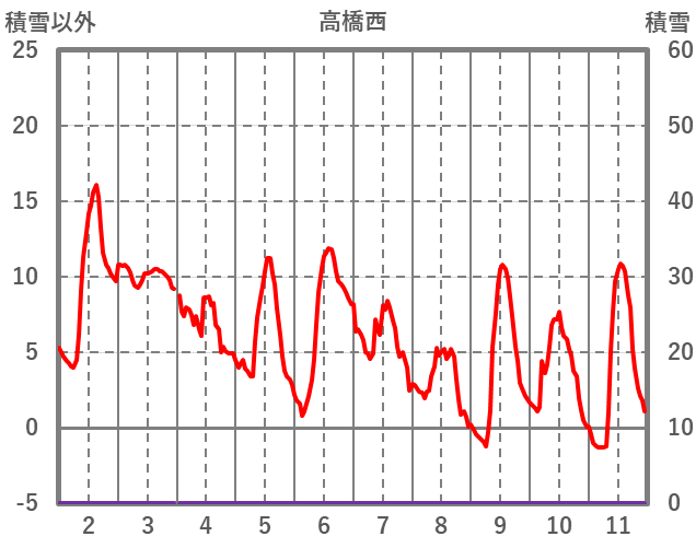 | 日 | 時 | 気温 | 降水 | 風向/風速 | 日照 | 積雪 | 降雪 |