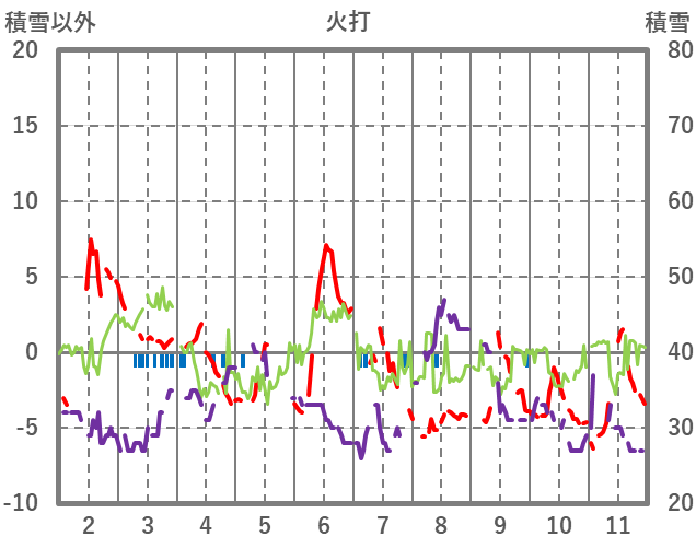 | 日 | 時 | 気温 | 降水 | 風向/風速 | 日照 | 積雪 | 降雪 |