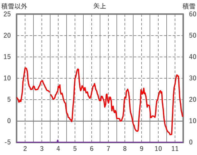 | 日 | 時 | 気温 | 降水 | 風向/風速 | 日照 | 積雪 | 降雪 |