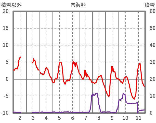 | 日 | 時 | 気温 | 降水 | 風向/風速 | 日照 | 積雪 | 降雪 |