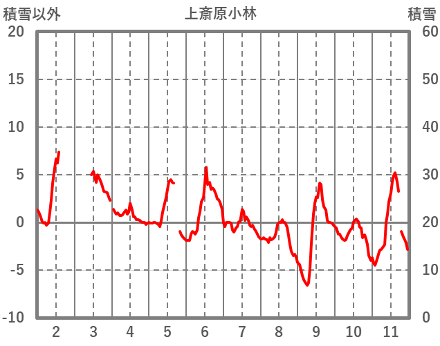 | 日 | 時 | 気温 | 降水 | 風向/風速 | 日照 | 積雪 | 降雪 |