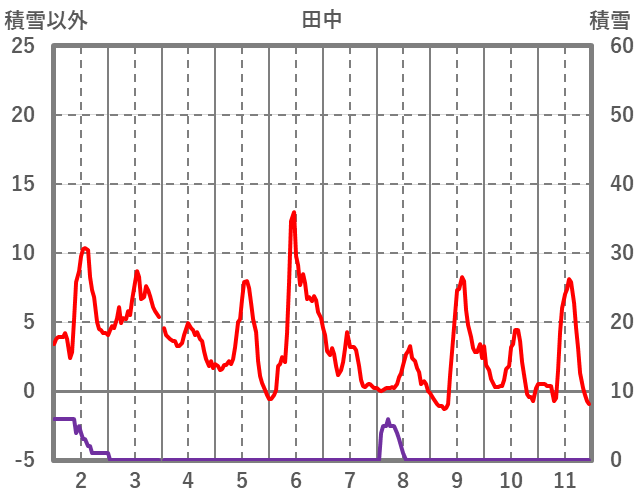 | 日 | 時 | 気温 | 降水 | 風向/風速 | 日照 | 積雪 | 降雪 |