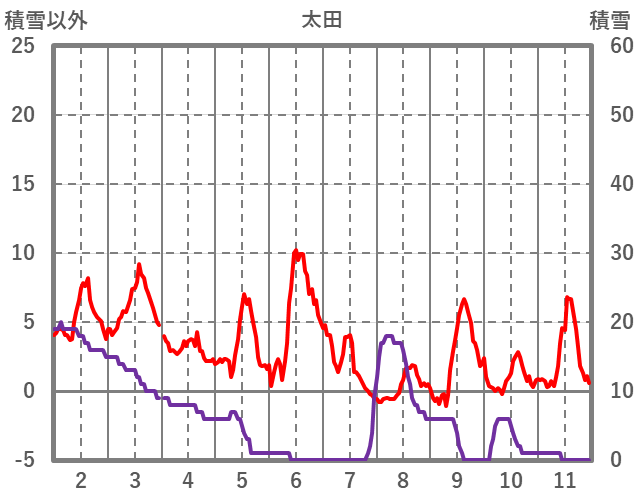| 日 | 時 | 気温 | 降水 | 風向/風速 | 日照 | 積雪 | 降雪 |