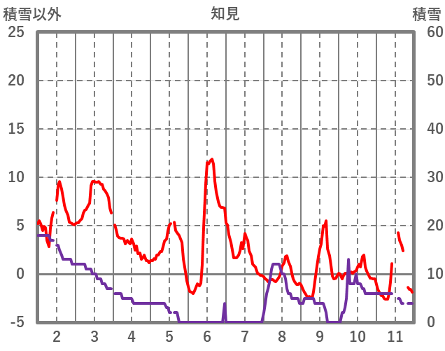 | 日 | 時 | 気温 | 降水 | 風向/風速 | 日照 | 積雪 | 降雪 |