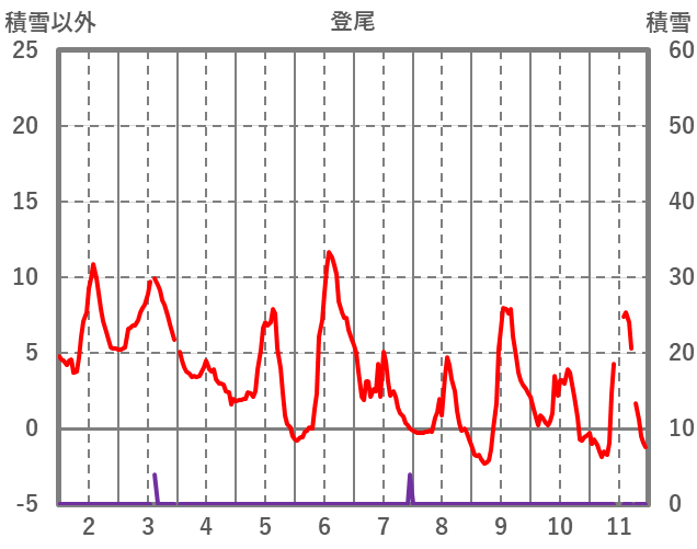 | 日 | 時 | 気温 | 降水 | 風向/風速 | 日照 | 積雪 | 降雪 |