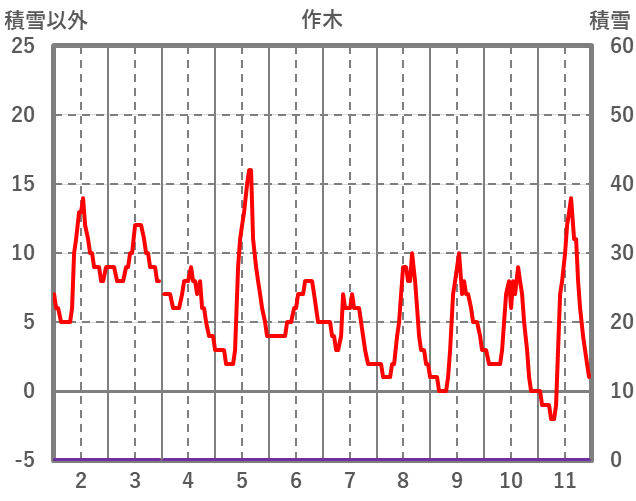 | 日 | 時 | 気温 | 降水 | 風向/風速 | 日照 | 積雪 | 降雪 |