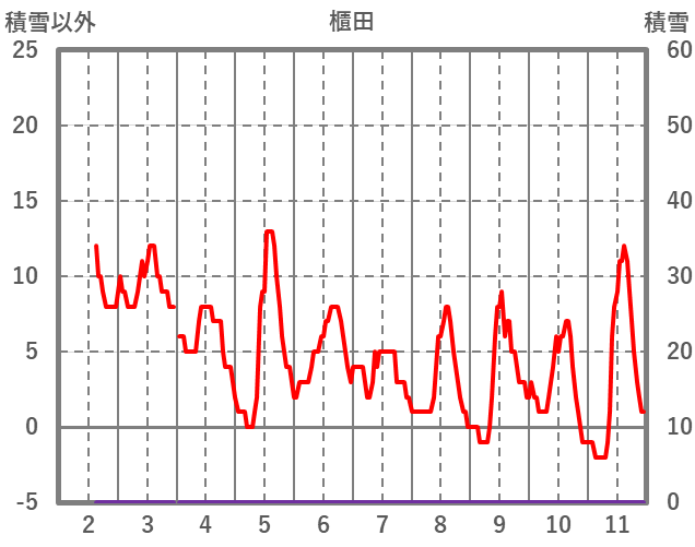 | 日 | 時 | 気温 | 降水 | 風向/風速 | 日照 | 積雪 | 降雪 |
