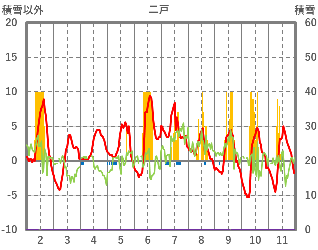 | 日 | 時 | 気温 | 降水 | 風向/風速 | 日照 | 積雪 | 降雪 |