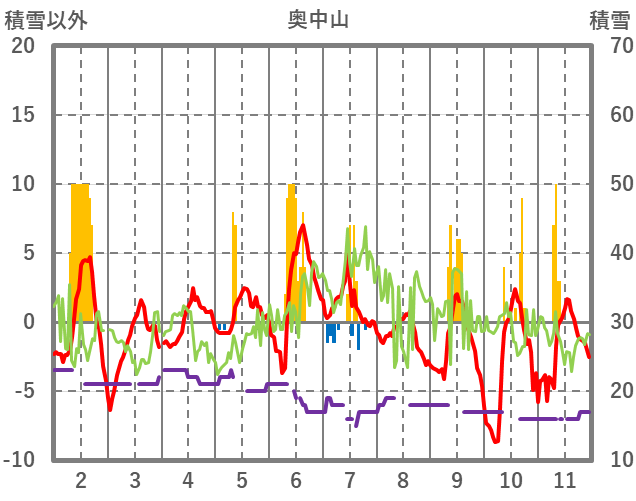 | 日 | 時 | 気温 | 降水 | 風向/風速 | 日照 | 積雪 | 降雪 |