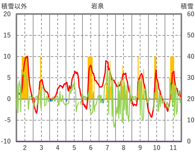 | 日 | 時 | 気温 | 降水 | 風向/風速 | 日照 | 積雪 | 降雪 |