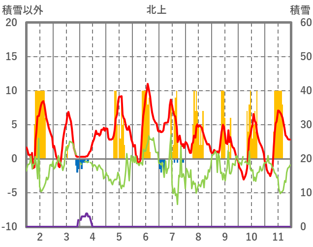 | 日 | 時 | 気温 | 降水 | 風向/風速 | 日照 | 積雪 | 降雪 |
