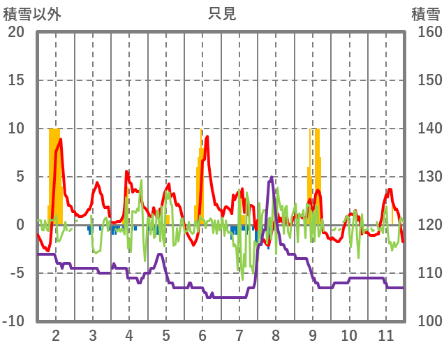 | 日 | 時 | 気温 | 降水 | 風向/風速 | 日照 | 積雪 | 降雪 |