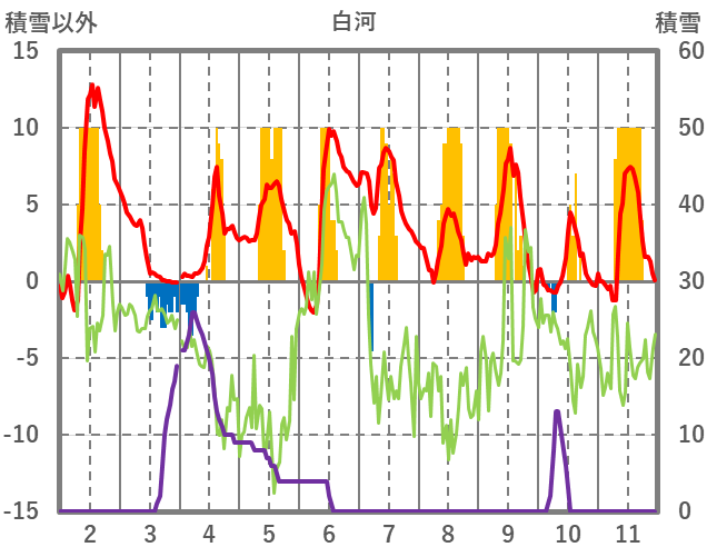| 日 | 時 | 気温 | 降水 | 風向/風速 | 日照 | 積雪 | 降雪 |
