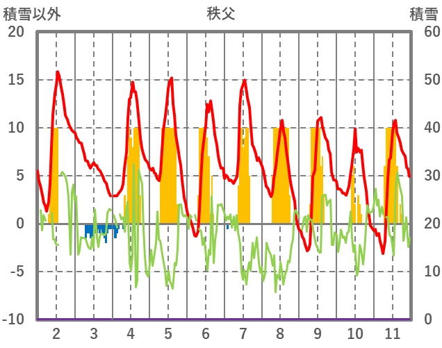 | 日 | 時 | 気温 | 降水 | 風向/風速 | 日照 | 積雪 | 降雪 |
