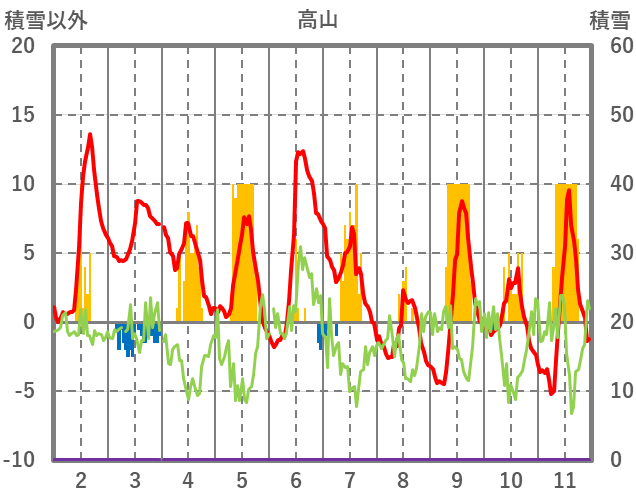| 日 | 時 | 気温 | 降水 | 風向/風速 | 日照 | 積雪 | 降雪 |