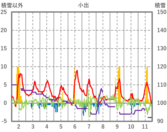 | 日 | 時 | 気温 | 降水 | 風向/風速 | 日照 | 積雪 | 降雪 |