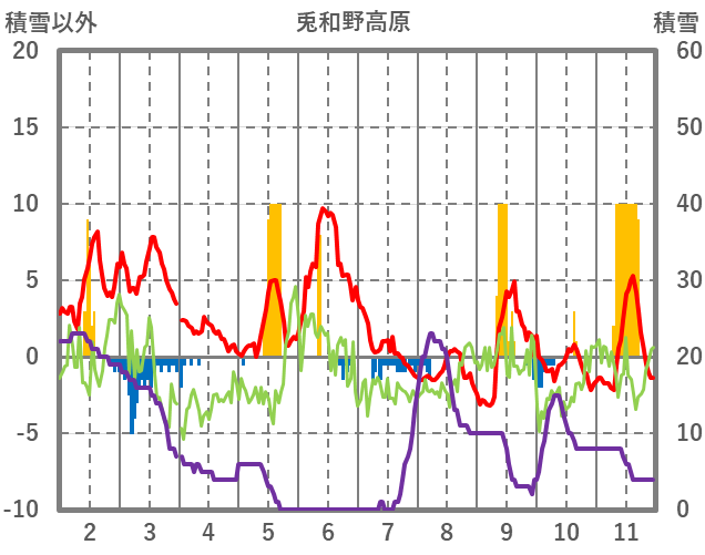 | 日 | 時 | 気温 | 降水 | 風向/風速 | 日照 | 積雪 | 降雪 |