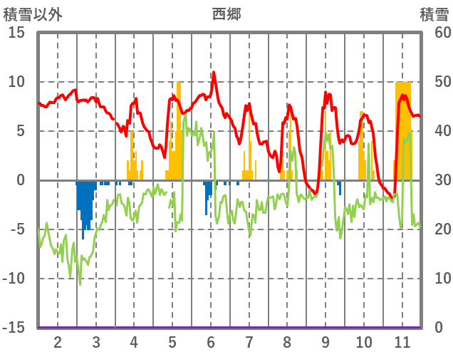 | 日 | 時 | 気温 | 降水 | 風向/風速 | 日照 | 積雪 | 降雪 |