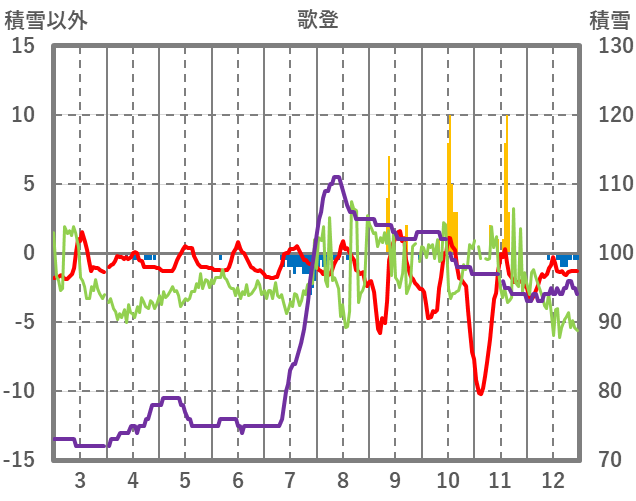 | 日 | 時 | 気温 | 降水 | 風向/風速 | 日照 | 積雪 | 降雪 |
