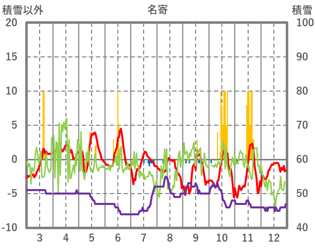 | 日 | 時 | 気温 | 降水 | 風向/風速 | 日照 | 積雪 | 降雪 |