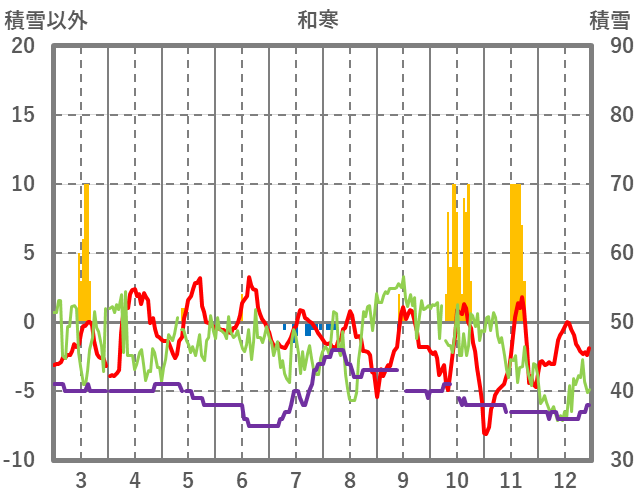 | 日 | 時 | 気温 | 降水 | 風向/風速 | 日照 | 積雪 | 降雪 |