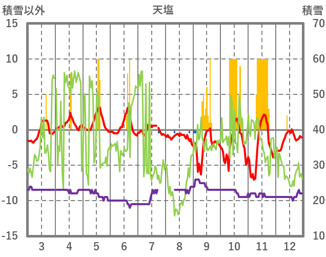 | 日 | 時 | 気温 | 降水 | 風向/風速 | 日照 | 積雪 | 降雪 |