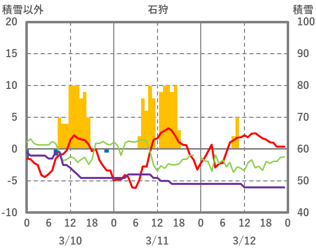 | 日 | 時 | 気温 | 降水 | 風向/風速 | 日照 | 積雪 | 降雪 |
