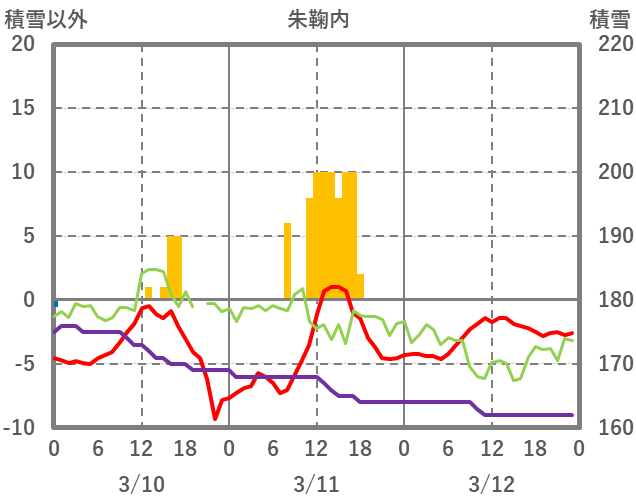 | 日 | 時 | 気温 | 降水 | 風向/風速 | 日照 | 積雪 | 降雪 |