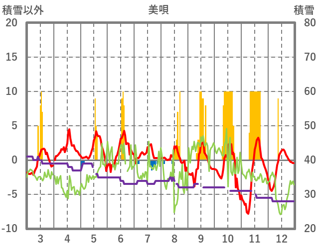 | 日 | 時 | 気温 | 降水 | 風向/風速 | 日照 | 積雪 | 降雪 |