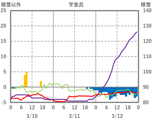 | 日 | 時 | 気温 | 降水 | 風向/風速 | 日照 | 積雪 | 降雪 |
