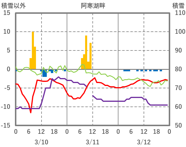 | 日 | 時 | 気温 | 降水 | 風向/風速 | 日照 | 積雪 | 降雪 |