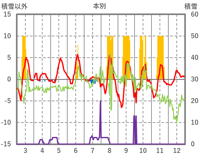 | 日 | 時 | 気温 | 降水 | 風向/風速 | 日照 | 積雪 | 降雪 |